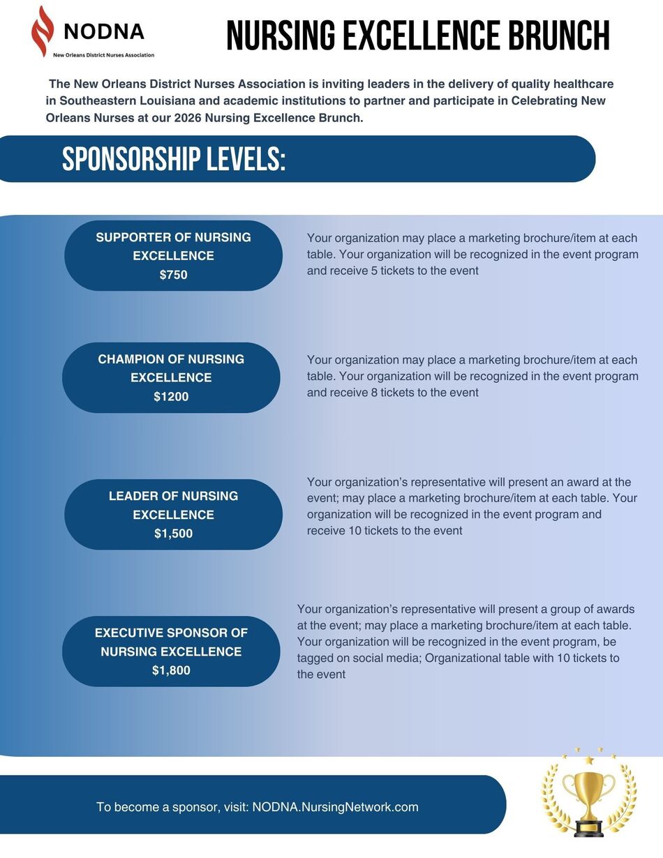 We are excited to announce the opening of nominations for the 2026 Crescent City Nurse Excellence Brunch, to be held during National Nurses Week on Saturday, May 9, 2026, at the Audubon Tea Room from 10:00 a.m. to 1:00 p.m.